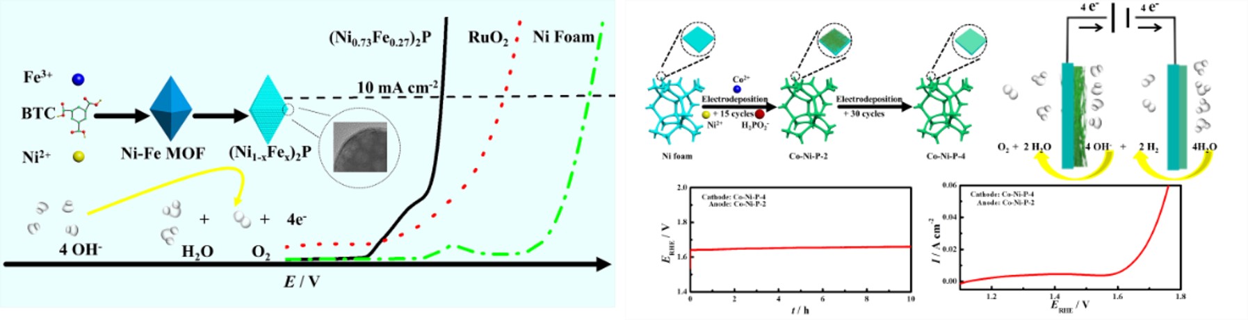 水熱合成(Ni1-xFex)2P(左)及電沉積制備的Co-Ni-P(右)用于堿性電催化析氧性能示意圖
