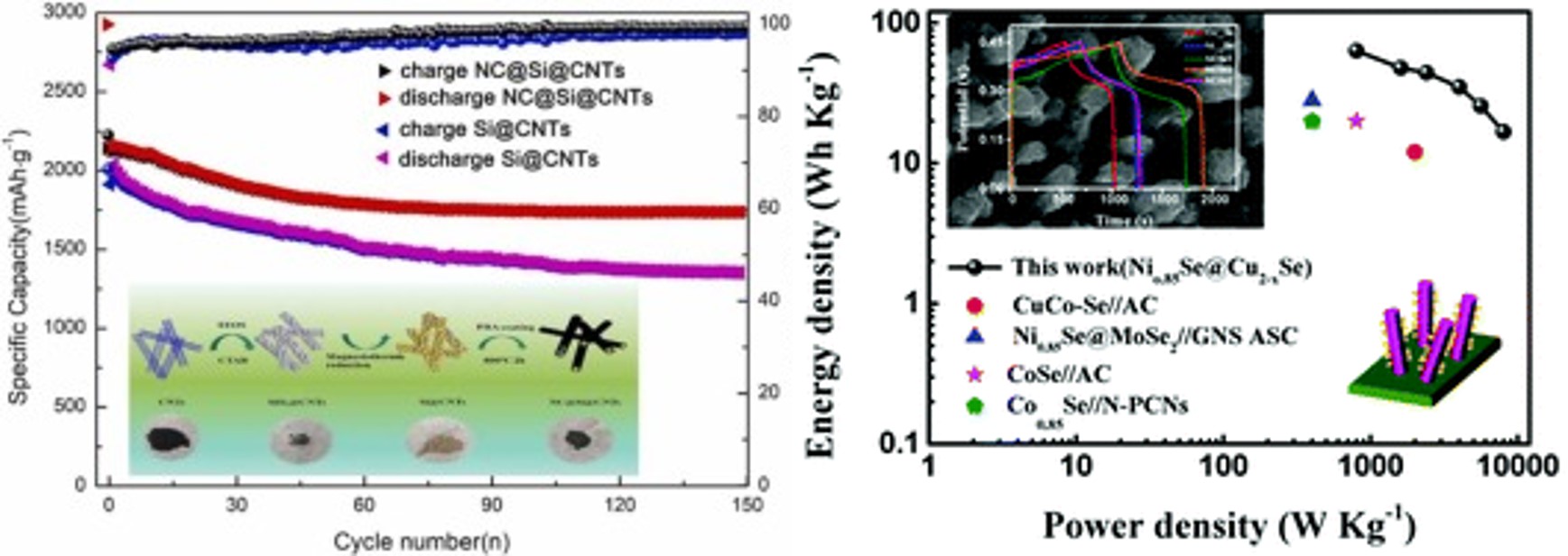 NC@Si@CNTs作為鋰離子電池負(fù)極材料性能圖(左)及Ni0.85Se@Cu2?xSe作為超級(jí)電容器電極材料的Ragon圖(右)
