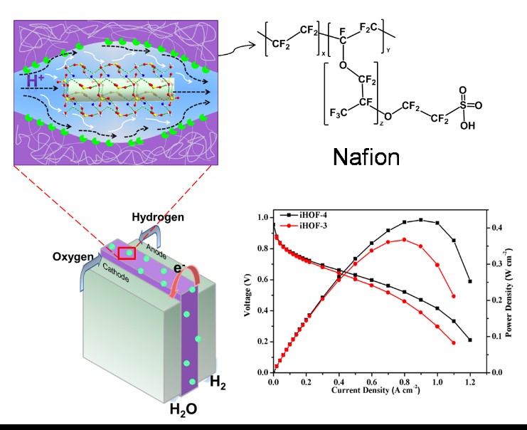 我?;瘜W(xué)與化工學(xué)院曹麗慧教授開展的研究工作利用酸性與堿性有機(jī)分子構(gòu)筑酸堿對(duì)的原理制備雙組分離子型HOFs材料,通過離子交換反應(yīng)制備了具有DBpy·2I和萘二磺酸化合物的四種雙組分離子型HOF。研究結(jié)果表明,具有不同磺酸基配體位置的四種iHOF顯示出四種不同的氫鍵結(jié)構(gòu)。阻抗譜測(cè)量表明,iHOF-3和iHOF-4的質(zhì)子電導(dǎo)率可以分別達(dá)到1.16 × 10-3和2.76 × 10-3S·cm-1。iHOF/Nafion復(fù)合膜作為固體電解質(zhì)的燃料電池測(cè)試初步研究表明,6%-iHOF-4/Nafion的最大功率密度可達(dá)到0.42 W·cm-2,6%-iHOF-3/Nafion可達(dá)到0.36 W·cm-2。隨著對(duì)此類材料的進(jìn)一步研究,將會(huì)設(shè)計(jì)出更多具有高質(zhì)子傳導(dǎo)性的iHOFs,這將在燃料電池領(lǐng)域顯示出巨大的潛力。