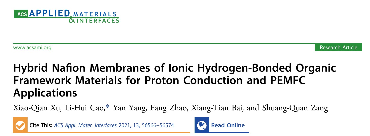 相關(guān)成果以“Hybrid Nafion Membranes of Ionic Hydrogen-Bonded Organic Framework Materials for Proton Conduction and PEMFC Applications”為題,發(fā)表在ACS Applied Materials & Interfaces(IF = 10.383)上。陜西科技大學(xué)為論文第一通訊單位,化工學(xué)院2018級(jí)碩士研究生徐小倩為該論文的第一作者,曹麗慧教授為第二作者和論文唯一通訊作者。
