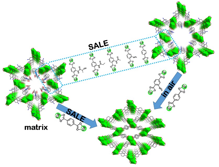 金屬有機(jī)框架(MOF)作為一類功能性多孔晶態(tài)框架材料,由于其可控的結(jié)構(gòu)和潛在的應(yīng)用,引起了人們的廣泛關(guān)注。其結(jié)構(gòu)的修飾與改良,性質(zhì)功能的調(diào)控和提升一直是該領(lǐng)域的研究重點(diǎn)。近幾年科學(xué)家們開發(fā)了一種通過逐步反應(yīng)實(shí)現(xiàn)配位聚合物多功能化的復(fù)雜合成策略——溶劑輔助連接體交換(SALE)。溶劑輔助連接體交換是指將配位聚合物作為母體加入到含有高濃度的外加有機(jī)配體溶液中反應(yīng),外加配體替換原配合物中的配體形成與母體具有相似框架的產(chǎn)物。通過合成后修飾(PSM)策略可以合成更復(fù)雜和多功能化的MOF材料。此外,由于其獨(dú)特的物理化學(xué)性能與結(jié)構(gòu)息息相關(guān),MOF材料在外部條件的刺激下可能會(huì)發(fā)生結(jié)構(gòu)轉(zhuǎn)變。作為研究結(jié)構(gòu)改變引起性能變化的理想模型,功能性晶態(tài)框架MOF材料在光、熱、壓力或pH值等外部刺激作用下結(jié)構(gòu)和性質(zhì)上的開關(guān)行為吸引了科學(xué)家們?cè)絹碓蕉嗟年P(guān)注。