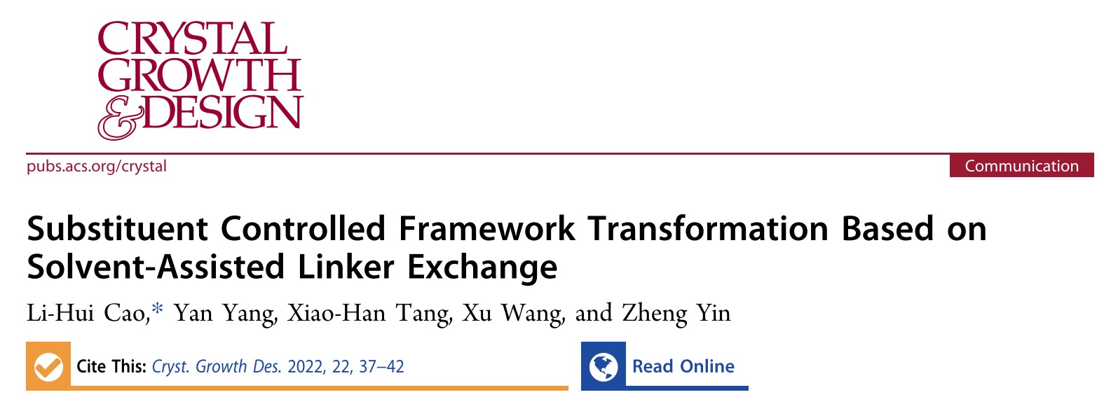 相關(guān)成果以“Substituent Controlled Framework Transformation Based on Solvent-Assisted Linker Exchange”為題,發(fā)表在Crystal Growth & Design上(IF = 4.010)上。陜西科技大學(xué)為論文唯一通訊單位,曹麗慧教授為第一作者和論文唯一通訊作者,化工學(xué)院2019級(jí)碩士研究生楊妍為該論文的第二作者。