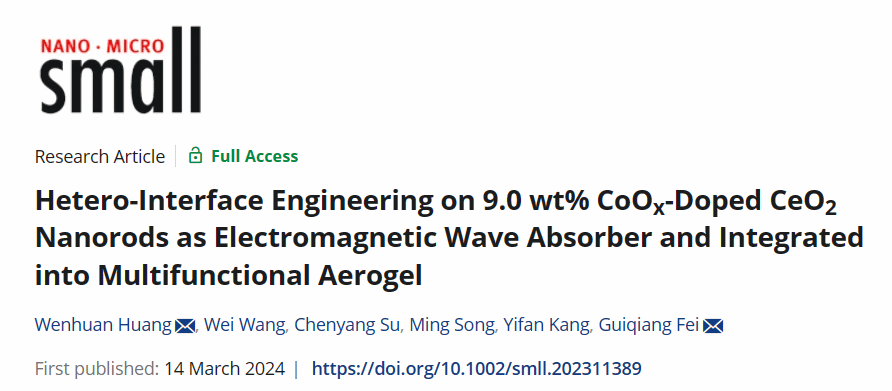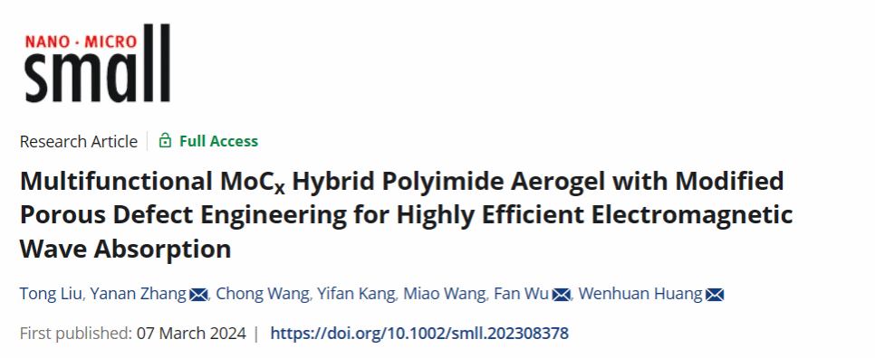 近日,我?;瘜W(xué)與化工學(xué)院黃文歡教授團(tuán)隊(duì)圍繞電磁材料微納結(jié)構(gòu)的精確構(gòu)造及性能調(diào)控開展了一系列研究工作,先后在《Small》期刊發(fā)表了兩篇研究論文。分別題為“Multifunctional MoCx Hybrid Polyimide Aerogel with Modified Porous Defect Engineering for Highly Efficient Electromagnetic Wave Absorption”及“Hetero-Interface Engineering on 9.0 wt% CoOx-Doped CeO2 Nanorods as Electromagnetic Wave Absorber and Integrated into Multifunctional Aerogel”。