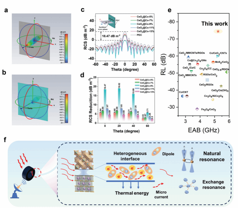該成果提出了一種簡便的方法,可以大規(guī)模合成具有不同CoOx修飾量的CeO2@Co-x% (x= 5,7,9,11,13)系列電磁波吸收材料(EWAMs)。研究表明,通過調(diào)制摻雜CoOx的比例,在CeO2@Co-9%內(nèi)形成合理的異質(zhì)界面,增強(qiáng)了自然共振和交換共振,提高了磁損耗能力,優(yōu)化了阻抗匹配。通過異質(zhì)界面工程,利用CoOx的摻雜促進(jìn)了CeO2的電荷積累、界面極化和多重散射,增強(qiáng)了材料對(duì)電磁波的吸收和衰減,優(yōu)化了阻抗匹配。CeO2@Co-9%材料表現(xiàn)出了最小反射損耗(RLmin)-74.4 dB、優(yōu)異有效吸收帶寬(EAB)為5.26 GHz。
