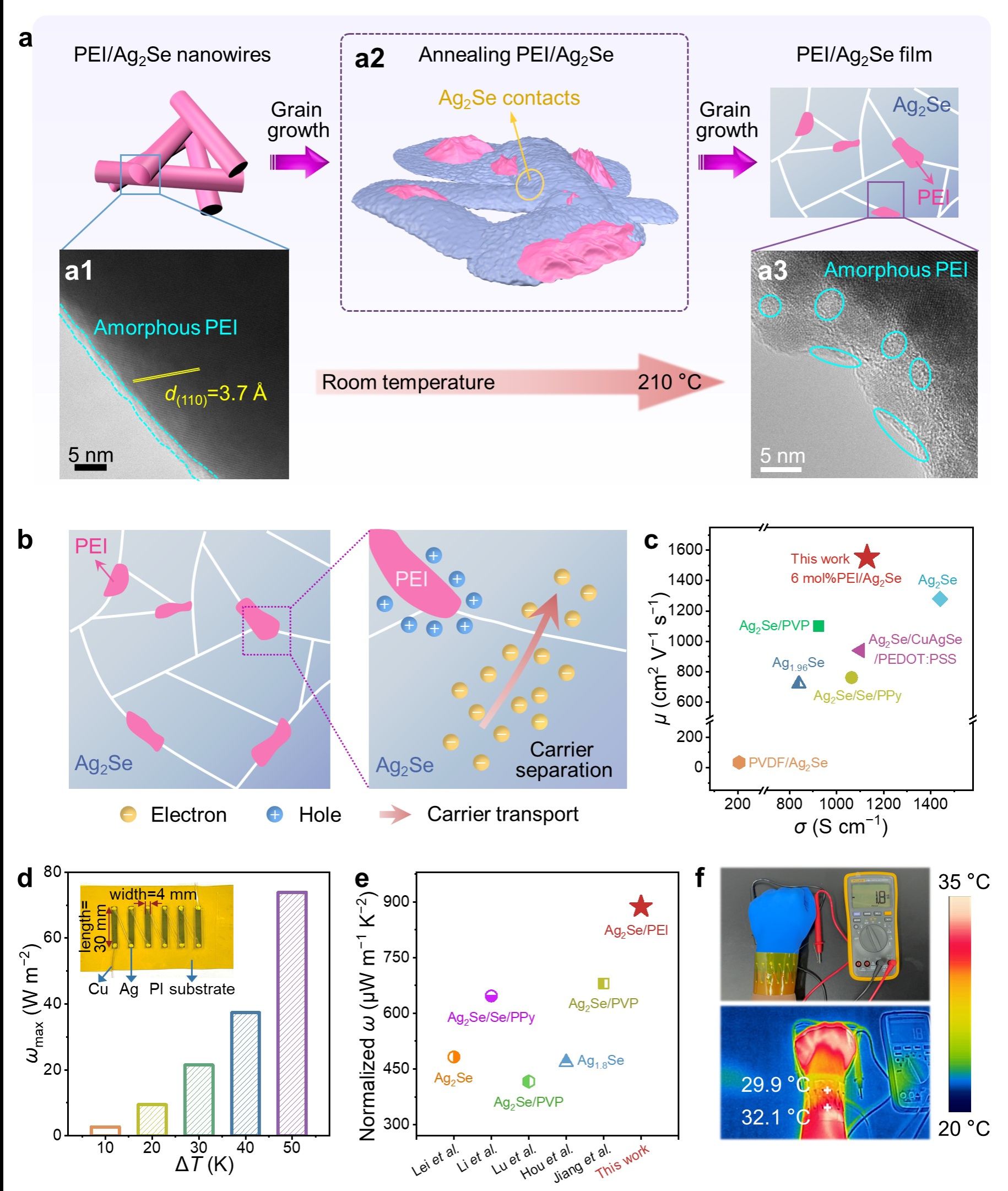 自供電技術(shù)對(duì)于物聯(lián)網(wǎng)時(shí)代可穿戴設(shè)備和柔性電子器件的發(fā)展具有重要意義,半導(dǎo)體熱電材料具有的塞貝克效應(yīng)能夠?qū)⒌推肺粺崃浚ㄈ缛梭w熱量或環(huán)境熱量)直接轉(zhuǎn)換為電能實(shí)現(xiàn)自供電。n型Ag2Se薄膜是室溫及近室溫區(qū)的高性能熱電材料之一,然而,Ag2Se的低載流子遷移率限制了其電導(dǎo)率和功率因數(shù)的進(jìn)一步提升,進(jìn)而使其作為柔性熱電器件應(yīng)用時(shí)表現(xiàn)出不夠高的功率密度。