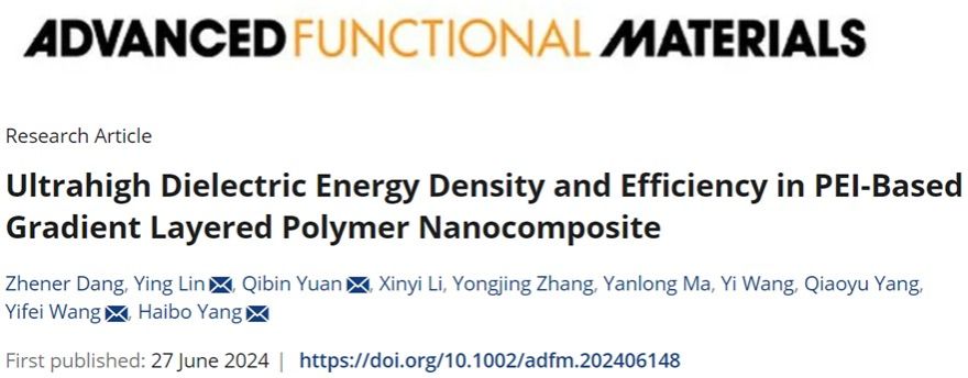 近日,材料科學(xué)與工程學(xué)院楊海波教授團隊,在國際頂級期刊《Advanced Functional Materials》(IF:18.5)上發(fā)表了題為“Ultrahigh Dielectric Energy Density and Efficiency in PEI-based Gradient Layered Polymer Nanocomposite”的研究論文。我校楊海波教授、林營教授、袁啟斌副教授和西安交通大學(xué)王軼飛副教授為文章共同通訊作者,材料學(xué)院博士生黨禎兒為文章第一作者,陜西科技大學(xué)為第一通訊單位。