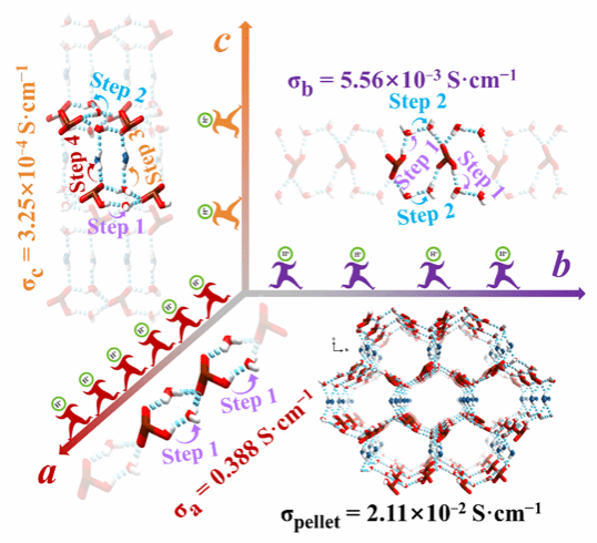 本文利用聯(lián)苯二磷酸和1,1’-二氨基-4,4’-二聯(lián)吡啶為原料制備了一例大尺寸的三維(3D)氫鍵網(wǎng)絡(luò)結(jié)構(gòu)iHOF-16,該材料具有優(yōu)異的熱穩(wěn)定性和化學(xué)穩(wěn)定性,在強酸堿條件下也能保持高結(jié)晶度和堅固的結(jié)構(gòu)。iHOF-16沿a軸、b軸和c軸方向分別具有0.388、5.56×10-3和3.25×10-4 S cm-1的高各向異性質(zhì)子傳導(dǎo)率。利用密度泛函理論(DFT)計算結(jié)果表明質(zhì)子最容易在a軸方向傳輸,從而產(chǎn)生超質(zhì)子傳導(dǎo)率。通過電荷輔助合成策略,為設(shè)計穩(wěn)定的超質(zhì)子導(dǎo)電材料提供了一種可行的方法。
