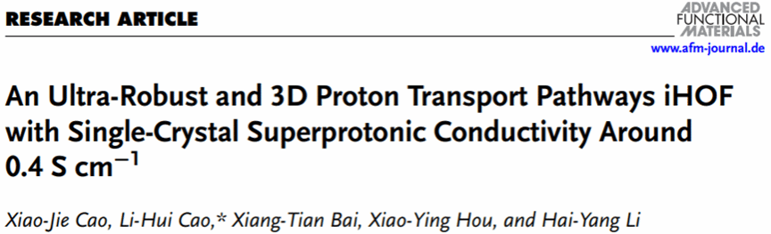 1. X.-J. Cao, L.-H. Cao*, X.-T. Bai, X.-Y. Hou, H.-Y. Li, An Ultra-Robust and 3D Proton Transport Pathways iHOF with Single Crystal Superprotonic Conductivity Around 0.4 S·cm?1, Adv. Funct. Mater., 2024, 2409359. (IF2023=18.5)