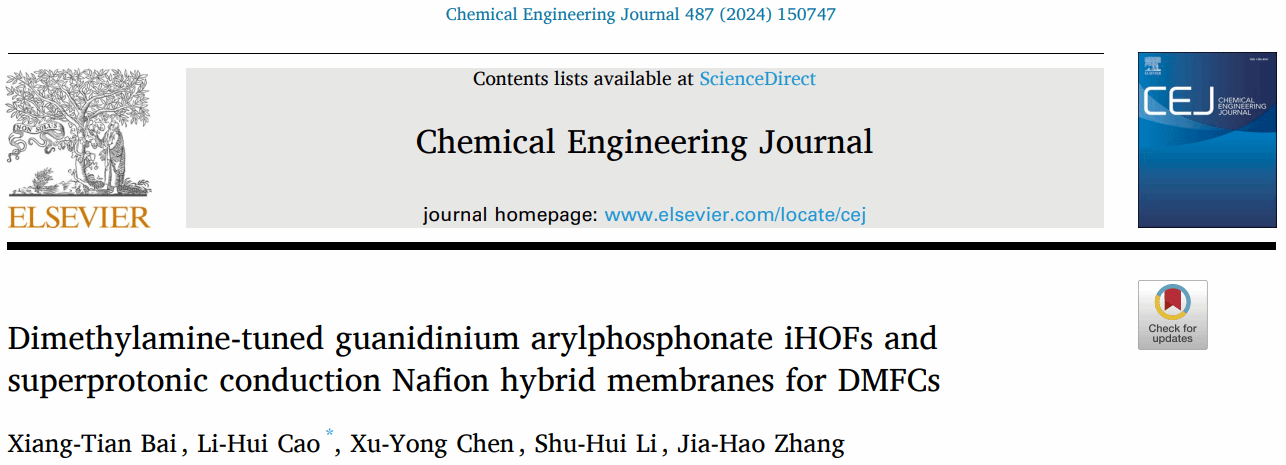 2. X.-T. Bai, L.-H. Cao*, X.-Y. Chen, S.-H. Li, J.-H. Zhang, Dimethylamine-tuned guanidinium arylphosphonate iHOFs and superprotonic conduction Nafion hybrid membranes for DMFCs, Chem. Eng. J., 2024, 487, 150747. (IF2023=13.3)