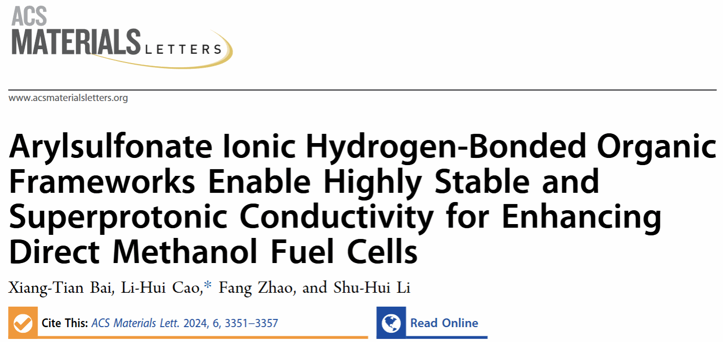 3. X.-T. Bai, L.-H. Cao*, F. Zhao, and S.-H. Li, Arylsulfonate Ionic Hydrogen-Bonded Organic Frameworks Enable Highly Stable and Superprotonic Conductivity for Enhancing Direct Methanol Fuel Cells, ACS Materials Lett., 2024, 6, 3351?3357. (IF2023=9.6)