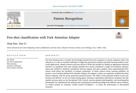 近日,數(shù)學(xué)與數(shù)據(jù)科學(xué)學(xué)院李劍教授團(tuán)隊在小樣本圖像識別方面取得新進(jìn)展,相關(guān)研究論文“Few-shot Classification with Fork Attention Adapter”于Pattern Recognition(PR)發(fā)表,主要工作由李劍教授和博士生孫潔琪共同完成,李劍教授、博士生孫潔琪分別為論文的第一作者或通訊作者,陜西科技大學(xué)為第一通訊單位。
