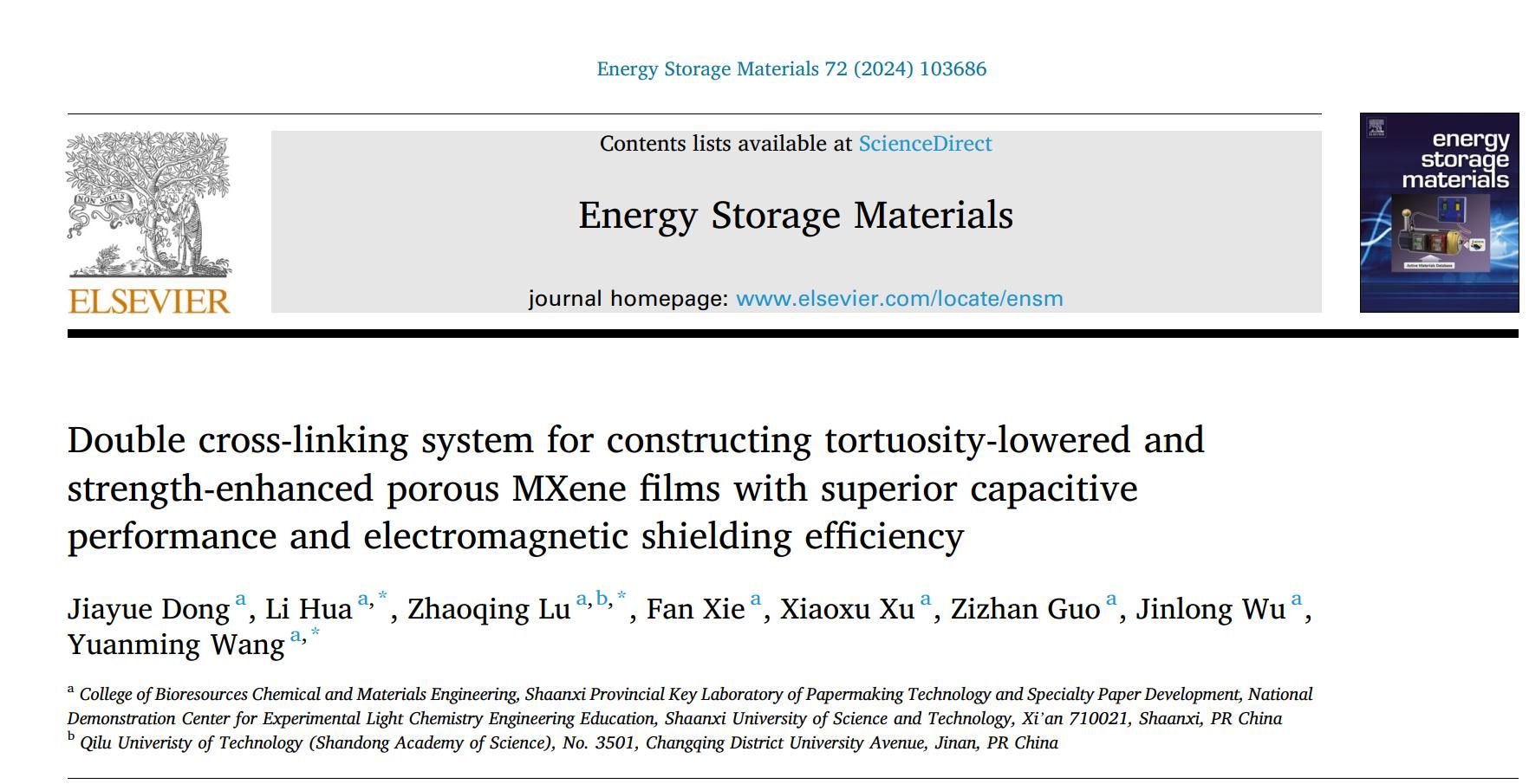 為了解決上述問題,陜西科技大學(xué)陸趙情教授團隊通過離子分子雙交聯(lián)體系設(shè)計和凍干干燥工藝,構(gòu)建了具有低曲率和高強度的三維結(jié)構(gòu)的柔性多孔MXene薄膜材料。該項工作從材料的的表面終端基團、層間距和定向結(jié)構(gòu)角度優(yōu)化了多孔材料的物理化學(xué)性質(zhì),并為制備輕質(zhì)高強的柔性儲能材料和電磁屏蔽材料提供了新思路。相關(guān)工作在《Energy Storage Materials》(IF:18.9)以“Double cross-linking system for constructing tortuosity-lowered and strength-enhanced porous MXene films with superior capacitive performance and electromagnetic shielding efficiency”為題發(fā)表。