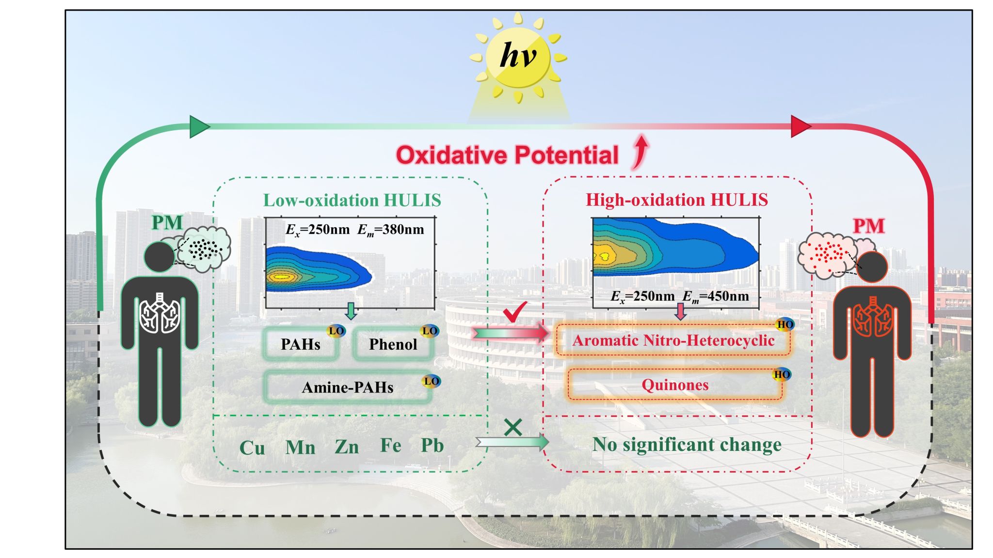 大氣顆粒物已成為全球五大死亡風(fēng)險(xiǎn)因素之一,直接威脅公共健康。然而,大氣顆粒物的毒性在復(fù)雜的環(huán)境過(guò)程中表現(xiàn)出動(dòng)態(tài)變化特征,這種現(xiàn)象為準(zhǔn)確評(píng)估大氣污染健康風(fēng)險(xiǎn)帶來(lái)了巨大挑戰(zhàn)。為此,陳慶彩教授團(tuán)隊(duì)圍繞太陽(yáng)光照對(duì)大氣顆粒物氧化毒性的影響特征和機(jī)制開(kāi)展了深入研究,通過(guò)揭示大氣顆粒物毒性隨環(huán)境因素的動(dòng)態(tài)變化特征和的化學(xué)機(jī)制,為改進(jìn)大氣污染源頭控制技術(shù)、優(yōu)化健康風(fēng)險(xiǎn)評(píng)估模型和制定精細(xì)化大氣污染防治策略提供了重要科學(xué)支撐。