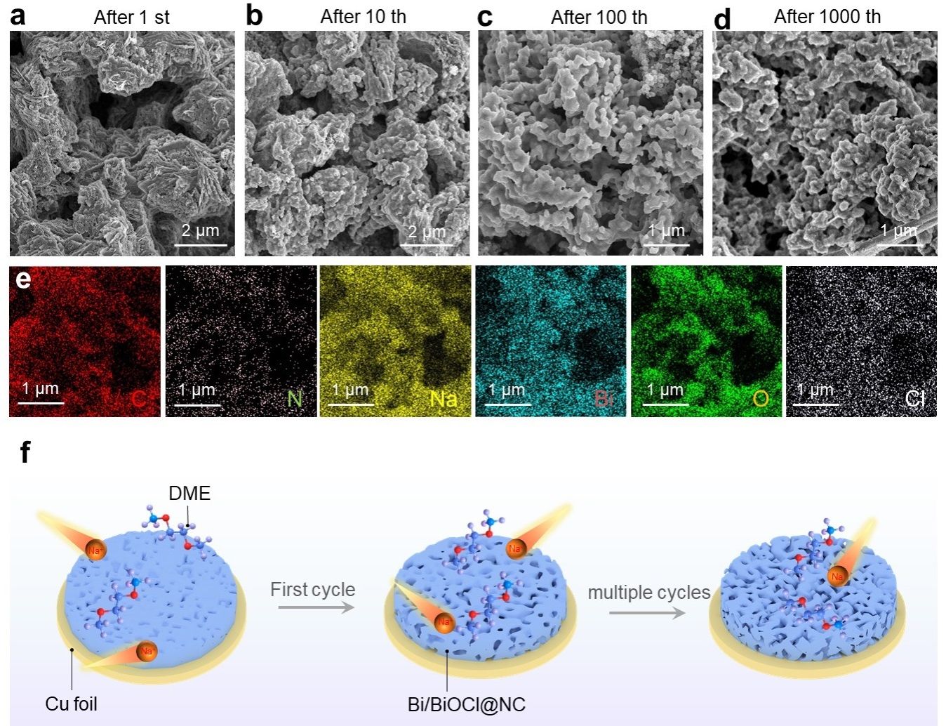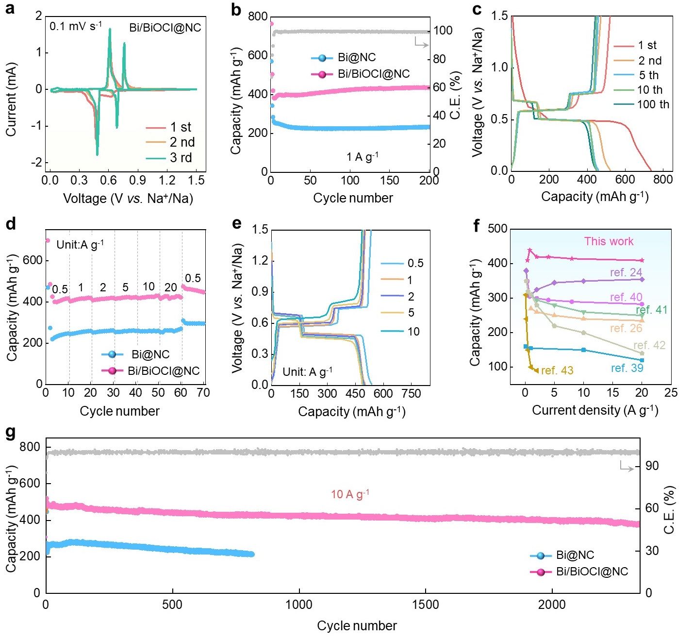 由于原料儲量豐富且成本低廉,鈉離子電池受到了前所未有的關(guān)注。然而,由于缺乏具有快速充電能力和極高穩(wěn)定性的替代負極材料,鈉離子電池的廣泛應用受到了阻礙。為了應對這一挑戰(zhàn),本論文開發(fā)了一種能夠快速充電的鈉離子電池負極材料,即嵌入氮摻雜碳框架的Bi/BiOCl(Bi/BiOCl@NC),該負極材料具有快速的Na+傳輸通道和超高的結(jié)構(gòu)穩(wěn)定性。在乙醚電解質(zhì)中循環(huán)時,Bi/BiOCl@NC會發(fā)生顯著的結(jié)構(gòu)轉(zhuǎn)變,形成三維多孔骨架結(jié)構(gòu),這有利于增加Na+傳輸通道和縮減Na+傳輸距離,并能適應充放電過程中的體積變化。通過密度泛函理論計算模擬Na+在該結(jié)構(gòu)中的儲存行為,發(fā)現(xiàn)Bi/BiOCl@NC具有較低的Na+傳輸勢壘(0.056 eV)和出色的電子導電性。獨特的結(jié)構(gòu)使得Bi/BiOCl@NC負極材料在20 A g–1條件下具有410 mAh g–1的超高Na+儲存能力,并能在10 A g–1的高電流密度條件下穩(wěn)定循環(huán)超過2300次,這一結(jié)果刷新了已報道的鈉離子電池負極材料的性能表現(xiàn)。這項工作為鈉離子電池提供了一種極具前景的負極材料,并將激勵研究人員開發(fā)出更多的新型儲能系統(tǒng)。