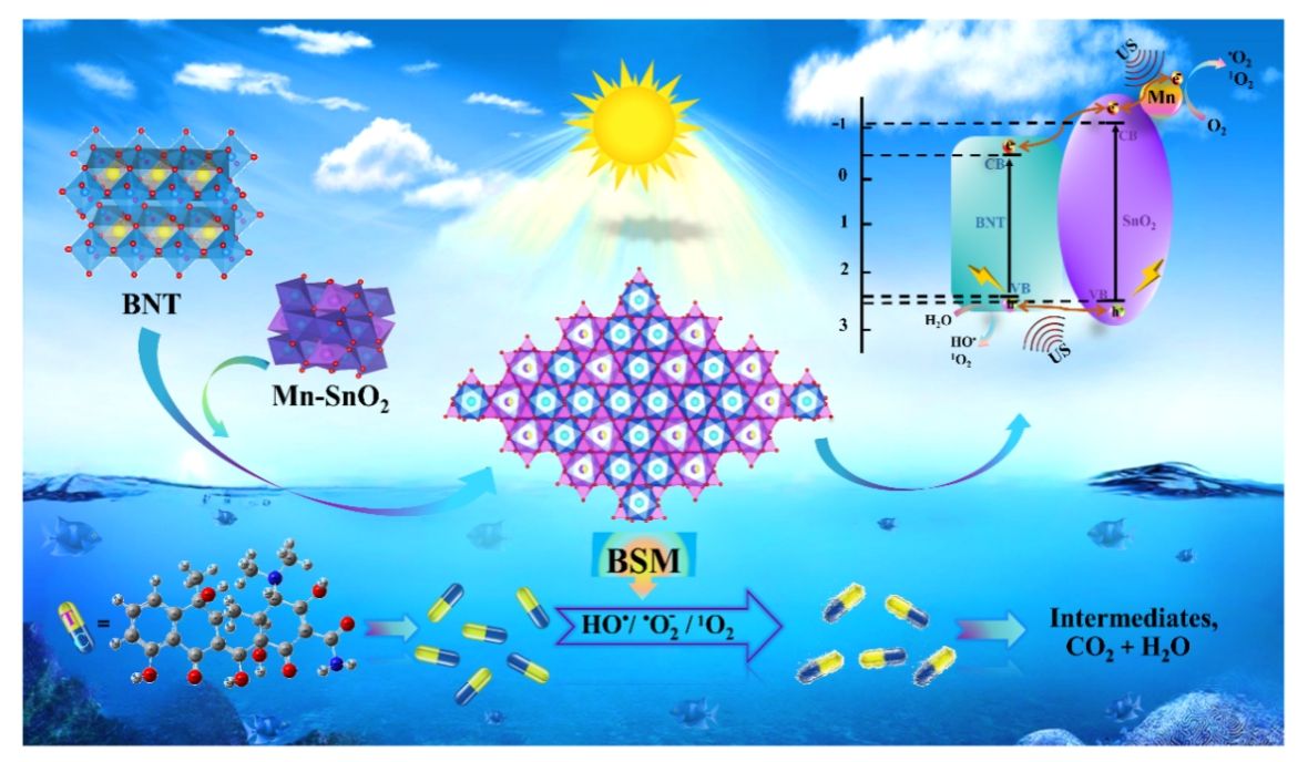 近年來,壓電光催化技術(shù)作為一種新興的污染治理方法,因其能夠在外部應(yīng)力作用下促進(jìn)光催化反應(yīng)而受到廣泛關(guān)注。在這一領(lǐng)域中,鉍基復(fù)合氧化物由于其獨特的壓電特性和良好的可見光響應(yīng)性,引起了研究人員的廣泛興趣。然而,盡管該類材料在催化降解中的潛力巨大,但其不同形態(tài)和結(jié)構(gòu)的優(yōu)化仍是提升催化性能的關(guān)鍵問題。針對這一挑戰(zhàn),研究發(fā)展了一種BNT@Mn-SnO2(BSM)異質(zhì)復(fù)合材料的合成方法,該材料結(jié)合了Bi0.5Na0.5TiO3(BNT)、錳納米粒子和SnO2。通過超聲波與可見光聯(lián)合照射,成功地在60分鐘內(nèi)實現(xiàn)了四環(huán)素(TC)的95.4%降解,顯著優(yōu)于傳統(tǒng)催化方法。BNT的固有電場與錳納米粒子的等離子體特性有效促進(jìn)了電荷的分離和傳輸,進(jìn)一步拓寬了光的吸收范圍,從而提高了光催化反應(yīng)的效率。該研究為提高抗生素降解效率提供了新的思路,并為開發(fā)更高效的廢水處理技術(shù)奠定了基礎(chǔ)。