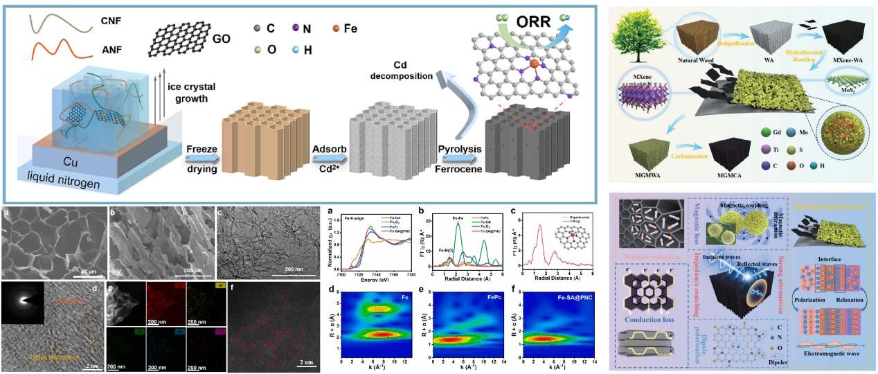 沈夢霞副教授課題組以木質(zhì)纖維等生物質(zhì)通過金屬交聯(lián)、活性物質(zhì)和熱犧牲金屬模板引入等策略,制備了一系列基于納米纖維素的氣凝膠體系,并通過對(duì)碳?xì)饽z微結(jié)構(gòu)中金屬活性位點(diǎn)優(yōu)化篩選、孔結(jié)構(gòu)和碳質(zhì)缺陷等精細(xì)調(diào)控,構(gòu)建了系列碳載金屬單原子催化劑,實(shí)現(xiàn)了高性能鋅空氣電池應(yīng)用。相關(guān)研究成果發(fā)表在Energy Storage Materials, Chemical Engineering Journal, Journal of Colloid and Interface Science等期刊。此外,利用改性木材氣凝膠的定向多孔結(jié)構(gòu)負(fù)載具有高介電常數(shù)的MXene和磁性稀土氧化物Gd2O3,并結(jié)合MoS2納米片以形成多重異質(zhì)界面,制備了具有磁-介電協(xié)同和多層結(jié)構(gòu)的MoS2@Gd2O3/Mxene多孔碳?xì)饽z復(fù)合材料,實(shí)現(xiàn)阻抗匹配和多重電磁波損耗機(jī)制,該木材衍生材料展現(xiàn)出優(yōu)異的電磁波吸收性能(Small 2024, 2306915)。其中有5篇論文入選ESI高被引論文,部分文章鏈接:https://doi.org/10.1016/j.ensm.2023.102790,https://doi.org/10.1002/smll.202306915,https://doi.org/10.1016/j.cej.2024.158551。