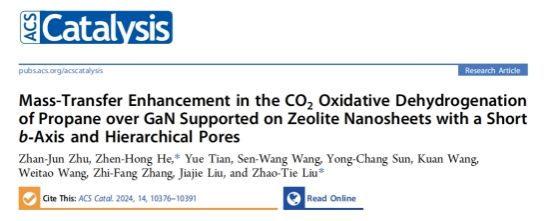 CO2氧化丙烷脫氫反應(yīng)(CO2-ODHP)不僅能生產(chǎn)大量丙烯,還能實(shí)現(xiàn)CO2減排和資源化回收,具有非常重要的意義。然而,該反應(yīng)在高溫條件下(>500 ℃)進(jìn)行,催化劑積碳是導(dǎo)致其失活的重要因素,也是高溫催化反應(yīng)中面臨的常見(jiàn)難題之一。圍繞該問(wèn)題,課題組開(kāi)發(fā)出具有微孔、中孔和大孔的片狀分子篩,并負(fù)載GaN制備出具有多級(jí)孔納米片結(jié)構(gòu)特征的GaN/HNS-1催化劑,能夠高效催化CO2-ODHP反應(yīng)進(jìn)行,同時(shí)能夠顯著降低失活速率。DFT理論計(jì)算和原位DRIFTS證實(shí),該反應(yīng)涉及直接脫氫(DHP)和逆水煤氣變換反應(yīng)(RWGS),尤其是采用的多級(jí)孔片層分子篩催化劑能夠顯著增加氣體分子傳質(zhì)擴(kuò)散效率,促進(jìn)積碳前驅(qū)體的快速轉(zhuǎn)移,從而顯著提高催化性能。相關(guān)研究工作以“Mass-transfer enhancement in the CO2 oxidative dehydrogenation of propane over GaN supported on zeolite nanosheets with a short b-axis and hierarchical pores”為題發(fā)表在催化領(lǐng)域國(guó)際著名期刊ACS Catalysis(影響因子IF=11.7)上。我校碩士研究生朱占軍為第一作者,何珍紅教授和劉昭鐵教授為共同通訊作者,陜西科技大學(xué)為第一通訊單位,陜西師范大學(xué)為共同通訊單位。