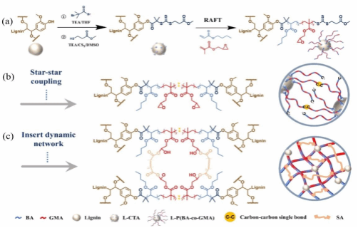 薛白亮教授等利用五/六元環(huán)碳酸酯反應(yīng)特點(diǎn),提出了具有動態(tài)交聯(lián)結(jié)構(gòu)的新型木質(zhì)素基非異氰酸酯聚氨酯合成路線。基于星型木質(zhì)素接枝共聚物的可控合成,利用核-核副反應(yīng)與動態(tài)化學(xué)策略,構(gòu)建了木質(zhì)素基動態(tài)雙網(wǎng)絡(luò)結(jié)構(gòu),探究了其在膠黏劑和可降解塑料等領(lǐng)域的應(yīng)用。該研究發(fā)表于Polymer Chemistry等國際期刊。