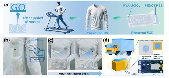【工作1】:受到樹木年輪結(jié)構(gòu)啟發(fā),設(shè)計(jì)了一種結(jié)構(gòu)簡(jiǎn)化的全向摩擦納米發(fā)電機(jī)(O-TENG)和環(huán)形嵌套電極結(jié)構(gòu),實(shí)現(xiàn)了在任意角度下的滑動(dòng)能量收集與電信號(hào)獲取。全印刷的O-TENG智能標(biāo)簽,能夠?qū)崿F(xiàn)多模式的應(yīng)用,在自充電電源、光調(diào)制系統(tǒng)和滑動(dòng)監(jiān)測(cè)中展示了極大的便利性。例如,貼于衣服表面可形成一種跑步交互的光調(diào)制顯示系統(tǒng);貼敷于包裝表面可作為智能傳感標(biāo)簽,用于監(jiān)測(cè)貴重物件的多角度突發(fā)滑動(dòng)。