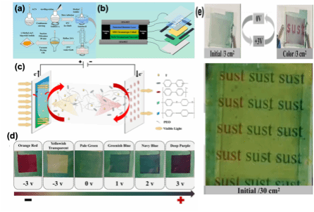 【工作4】:通過聚苯胺電極和合成的1-甲基-4,4’-聯(lián)吡啶碘化物(MBI)的互補(bǔ)結(jié)構(gòu),制備了多色電致變色器件。不僅能簡(jiǎn)化器件結(jié)構(gòu),同時(shí)增強(qiáng)器件的色彩豐富性(呈現(xiàn)紅、黃、綠、藍(lán)、紫的寬色域)。利用絲網(wǎng)印刷技術(shù)制備的光調(diào)制顯示器件,可以實(shí)現(xiàn)圖案的顯示和隱藏。該器件可應(yīng)用于智能窗、防偽和智能包裝等領(lǐng)域。
