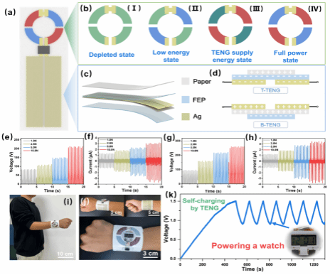 【工作2】:通過導(dǎo)電性、電容性和電致變色性能的協(xié)同增強(qiáng),印刷制備了具有寬色域、雙電極顏色組合及增強(qiáng)性能的紙面光調(diào)制顯示系統(tǒng)。同時(shí),利用紙張的摩擦起電特性,構(gòu)建了由雙面發(fā)電摩擦納米發(fā)電機(jī)驅(qū)動(dòng)的多信息顯示、儲(chǔ)能增強(qiáng)和高能量回收利用率的自充電能量顯示系統(tǒng)(SPEDS),并將此系統(tǒng)作為運(yùn)動(dòng)紙腕帶,在運(yùn)動(dòng)摩擦中,顯示相關(guān)信息。