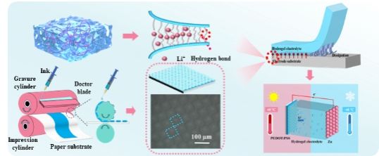 【工作3】:通過紙面的本征粗糙度和凹版印刷的微觀結(jié)構(gòu),有效提升了紙面功能層的電化學(xué)性能。同時(shí),基于霍夫邁斯特效應(yīng)以及紙張表面電極界面與電解質(zhì)的耦合增強(qiáng)作用,開發(fā)了一種新型耐低溫(-40 ℃)、全固態(tài)紙基自供能電致變色器件。