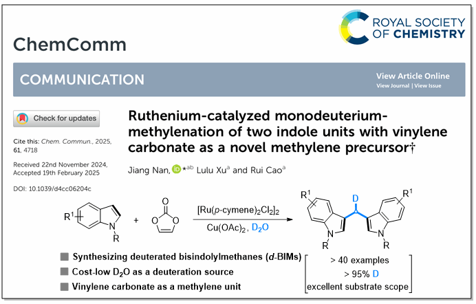 碳酸亞乙烯酯(VC)作為C2、C3合成子已得到廣泛而深入的研究,但作為C1合成子偶聯(lián)片段的開(kāi)發(fā)與應(yīng)用卻相對(duì)匱乏。南江團(tuán)隊(duì)近期成功開(kāi)發(fā)了一種釕催化吲哚類化合物與碳酸乙烯酯(VC)的單氘甲基化偶聯(lián)反應(yīng),并以此構(gòu)建結(jié)構(gòu)多樣的氘化雙吲哚甲烷衍生物(d-BIMs)。該方法的顯著優(yōu)勢(shì)體現(xiàn)在:1)創(chuàng)新性采用廉價(jià)易得的VC作為新型氘代亞甲基前體;2)成功實(shí)現(xiàn)藥物分子的后期氘代修飾與功能化。該策略為開(kāi)發(fā)氘標(biāo)記生物活性分子提供了新思路與新途徑。相關(guān)成果以“Ruthenium-catalyzed monodeuterium-methylenation of two indole units with vinylene carbonate as anovel methylene precursor”為題發(fā)表在自然指數(shù)期刊Chemical Communications上,實(shí)驗(yàn)工作主要由2022級(jí)碩士生徐露露完成。