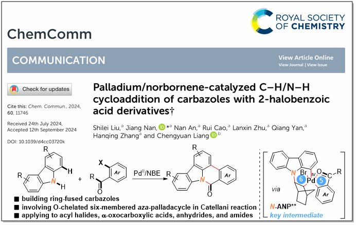 傳統(tǒng)的Catellani反應(yīng)從最初的芳基碘化物通過(guò)金屬鈀(0)與NBE的五元鈀雜環(huán)協(xié)同催化,將C-H活化、偶聯(lián)反應(yīng)與降冰片烯的遷移插入巧妙結(jié)合,在單一步驟中完成芳環(huán)上官能團(tuán)的引入。南江團(tuán)隊(duì)發(fā)展了一種鈀/降冰片烯(NBE)以六元鈀雜環(huán)參與轉(zhuǎn)化的協(xié)同催化體系,成功實(shí)現(xiàn)了2-溴苯甲酸與咔唑類化合物的C-H/N-H環(huán)加成反應(yīng)。該工作不僅拓展了Catellani反應(yīng)底物的多樣性,更從機(jī)理層面豐富了過(guò)渡金屬催化劑鈀物種的多樣性。該工作以“Palladium/norbornene-catalyzed C–H/N–Hcycloaddition of carbazoles with 2-halobenzoic acid derivatives”為題為題發(fā)表在自然指數(shù)期刊Chemical Communications上,實(shí)驗(yàn)工作主要由2023級(jí)博士生劉石磊完成。