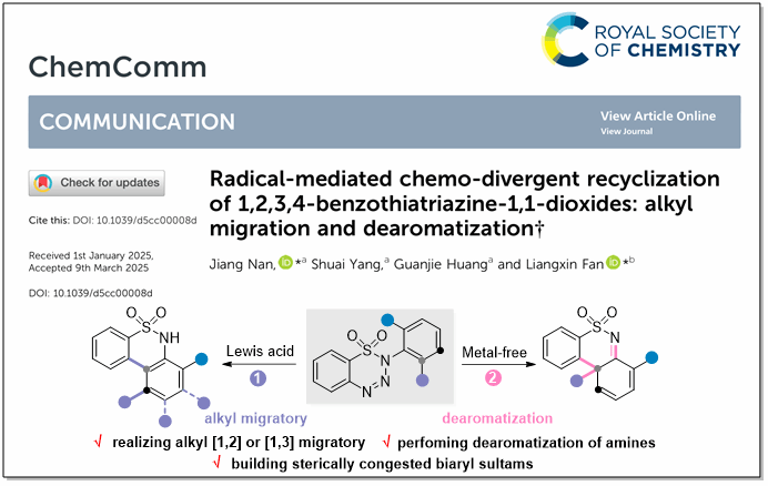 受熵不利的過(guò)渡態(tài)和σ-π超共軛效應(yīng)的影響,芳基C(sp2)-烷基重排的策略相對(duì)有限。南江團(tuán)隊(duì)通過(guò)創(chuàng)新自由基介導(dǎo)策略,成功實(shí)現(xiàn)苯并噻嗪氧化物脫氮?dú)猸h(huán)化轉(zhuǎn)化新方法。該工作突破傳統(tǒng)芳基重排反應(yīng)限制,開(kāi)發(fā)出新型芳基C(sp2)-烷基遷移路徑,高效合成傳統(tǒng)方法難以制備的大位阻二苯并磺酰胺類化合物;同步通過(guò)條件調(diào)控實(shí)現(xiàn)苯并噻嗪氧化物去芳構(gòu)化轉(zhuǎn)化,精準(zhǔn)構(gòu)筑含全取代季碳中心的新型分子骨架。相關(guān)成果以“Radical-mediated chemo-divergent recyclization of 1,2,3,4-benzothiatriazine-1,1-dioxides: alkyl migration and dearomatization”為題發(fā)表在自然指數(shù)期刊Chemical Communications上,實(shí)驗(yàn)工作主要由2022級(jí)碩士生楊帥完成。