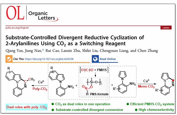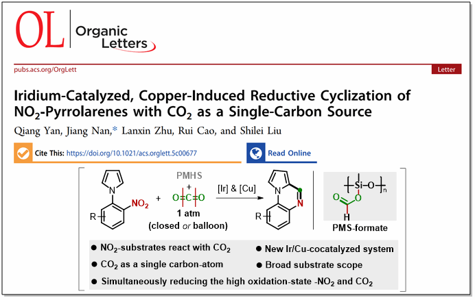 在有機(jī)合成領(lǐng)域,CO2與硝基化合物(-NO?)的反應(yīng)面臨嚴(yán)峻挑戰(zhàn),主要由于CO2熱力學(xué)穩(wěn)定難以活化,硝基則在強(qiáng)還原條件下才能轉(zhuǎn)化為胺。南江團(tuán)隊(duì)在前期工作基礎(chǔ)上發(fā)展了一種以CO2作為單一碳源與硝基化合物的催化轉(zhuǎn)化新方法。該催化過(guò)程巧妙采用PMHS作為還原劑,在一次操作中同時(shí)實(shí)現(xiàn)了最高氧化態(tài)硝基和CO2的雙重還原。詳盡的機(jī)理研究表明,銥催化劑在還原NO2部分中起著至關(guān)重要的作用,而銅催化劑在后續(xù)的甲?;襟E和C?H環(huán)化步驟中具有雙重功能。該工作以“Iridium-Catalyzed, Copper-Induced Reductive Cyclization of NO2Pyrrolarenes with CO2 as a Single-Carbon Source”為題發(fā)表在有機(jī)化學(xué)領(lǐng)域國(guó)際知名期刊Organic Letters上,實(shí)驗(yàn)工作主要由2022級(jí)博士生閆強(qiáng)完成。