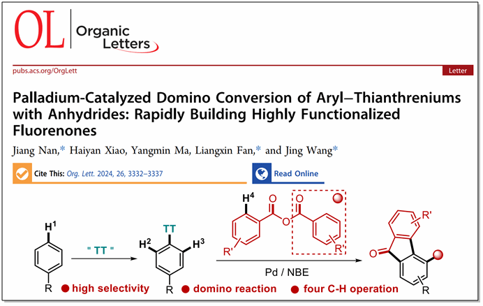 Catellani反應(yīng)被廣泛視為一種構(gòu)建復(fù)雜有機(jī)分子的強(qiáng)大手段,并因此引發(fā)了持續(xù)的關(guān)注與研究。與此同時(shí),作為一類新興的親電偶聯(lián)試劑,芳基噻蒽鹽(aryl-TTs)亦在近年來(lái)吸引了眾多學(xué)者的密切關(guān)注。南江教授團(tuán)隊(duì)發(fā)展了一種鈀催化的芳基噻蒽鹽與酸酐多米諾環(huán)化反應(yīng)新策略,可高效構(gòu)建一系列高度官能團(tuán)化的芴酮,首次揭示了芳基噻蒽鹽作為偶聯(lián)試劑的多米諾環(huán)化反應(yīng)模式,拓展了其反應(yīng)類型。該工作以“Palladium-Catalyzed Domino Conversion of Aryl?Thianthreniums with Anhydrides: Rapidly Building Highly Functionalized Fluorenones”為題發(fā)表在有機(jī)化學(xué)領(lǐng)域國(guó)際著名期刊Organic Letters上,實(shí)驗(yàn)工作主要由2021級(jí)碩士生肖海燕完成。