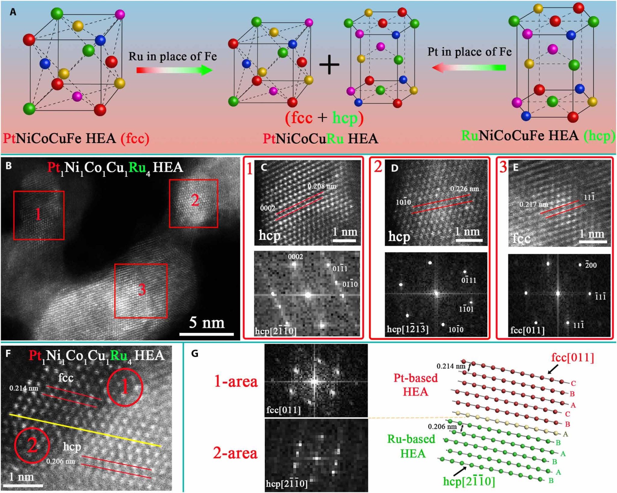 團(tuán)隊(duì)還深入探究了相關(guān)形成機(jī)制,發(fā)現(xiàn) Pt、Ru、Ir 等貴金屬元素可降低過渡金屬還原溫度,促進(jìn)單相固溶體形成,為優(yōu)化材料性能提供理論依據(jù)。同時(shí),通過調(diào)整 Pt 與 Ru 比例和還原溫度,借助原位掃描透射電子顯微鏡和密度泛函理論計(jì)算,首次實(shí)現(xiàn)同一納米顆粒中 fcc 和 hcp 相結(jié)構(gòu)的精確調(diào)控,為定制材料性能創(chuàng)造可能。