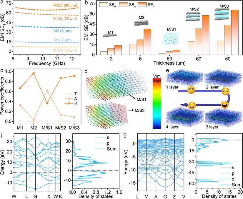 圖3 a) 復(fù)合薄膜的X波段電磁屏蔽效率;b) 復(fù)合薄膜的SET、SER和SEA的平均值;c)復(fù)合薄膜的R、A和T的功率系數(shù);d)樣品的模擬屏蔽效能;e) 不同電容器結(jié)構(gòu)的復(fù)合薄膜對(duì)電磁波的影響;f) 含缺陷SiC的能帶結(jié)構(gòu)和態(tài)密度;g) MXene/SiC能帶結(jié)構(gòu)和態(tài)密度