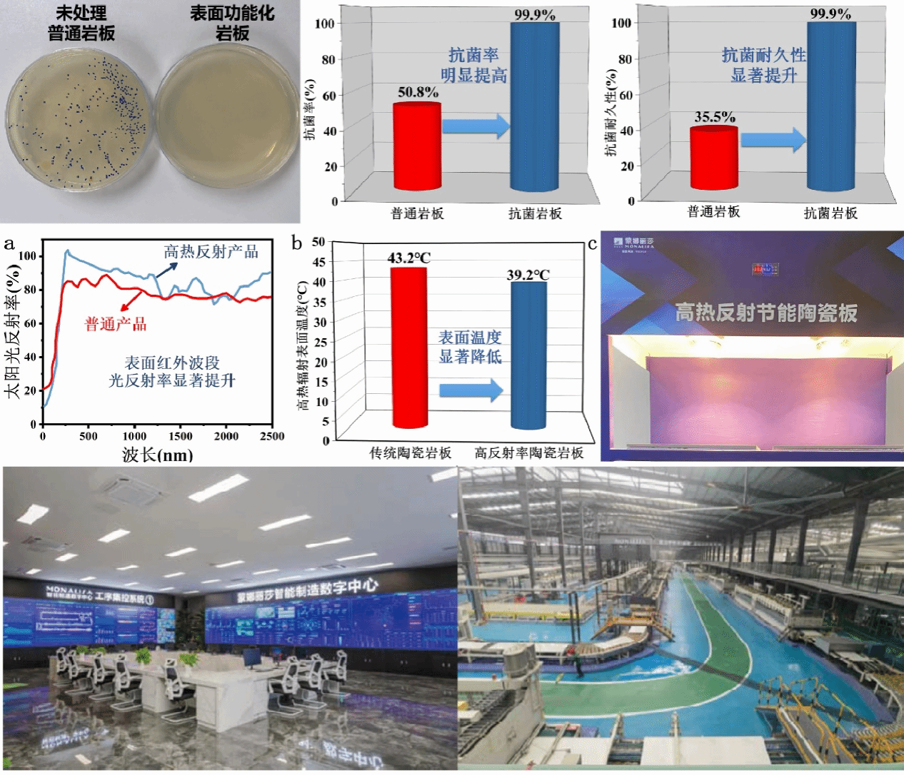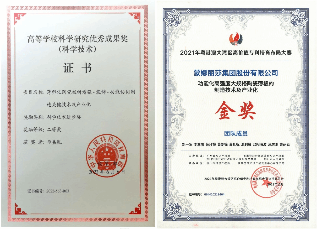 該團隊研發(fā)的高鋁超薄復合陶瓷巖板彎曲強度達到88Mpa、斷裂功超過290J/m2;通過高通透、低散射微晶熔體及功能性微晶負載技術(shù),巖板可呈現(xiàn)透光率與透光波長可控、兼具遠紅外發(fā)射(發(fā)射率0.917)、抗菌(大腸桿菌抗菌率>99.9%)、高太陽光反射(>90%)等物理化學性質(zhì),巖板的功能化應用價值顯著提升;實現(xiàn)了表面釉的金屬光干粒包裹、高折射閃光粒可控分布和柔性模塊雙面拋等多個超薄陶瓷巖板的產(chǎn)業(yè)化自主制造技術(shù),制造的3mm厚度大規(guī)格、高強度、多功能及高通透陶瓷巖板展現(xiàn)出高精準制造成品率(>99%)與優(yōu)品率(>90%),技術(shù)應用后累計銷售額20.12億元,新增利潤總額5.05億元,新增稅收總額1.31億元,為建材行業(yè)節(jié)約資源、節(jié)能減排、綠色制造的樹立了典范效果。上述成果獲得教育部科技進步二等獎1項,粵港澳大灣區(qū)高價值專利布局大賽金獎1項。