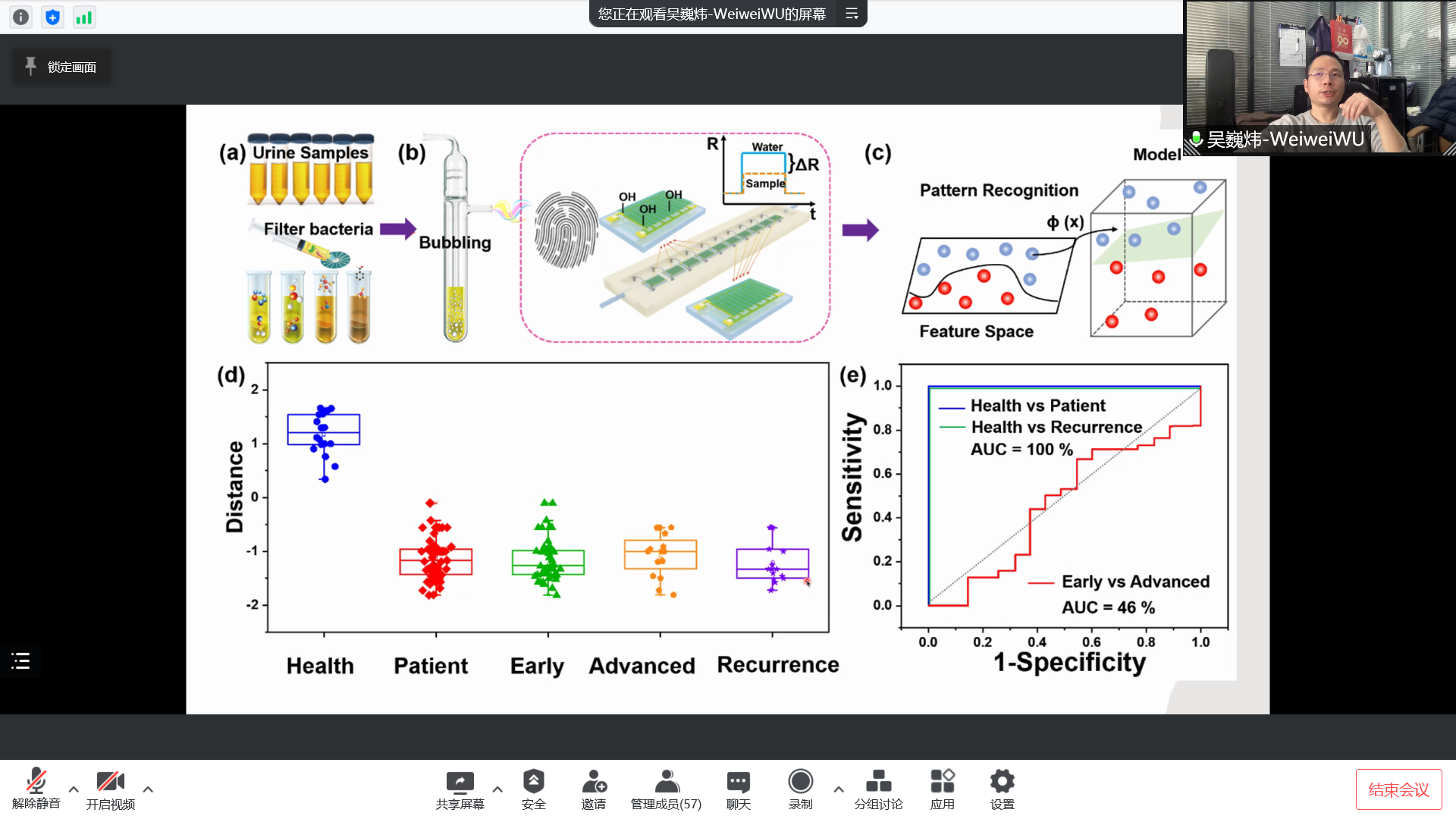 癌癥早期篩查、診斷和預后復發(fā)監(jiān)控是人類戰(zhàn)勝癌癥的主要手段之一,是國家“人民健康”重大戰(zhàn)略需求的組成部分。人體呼出氣體帶有與癌癥類型高度相關的揮發(fā)性有機化合物(VOCs),可以作為癌癥診斷的化學標志物。電子鼻是VOCs檢測的有效途徑之一,但靈敏度、特異性和選擇性是有待解決的關鍵問題。吳巍煒從電子鼻工作原理、電子鼻呼氣診斷研究的方法學出發(fā),詳細介紹課題組針對電子鼻人工嗅覺受體瓶頸,在導電聚合物VOCs傳感器陣列、傳感器濕度干擾壓制辦法、聚合物復合薄膜無源VOCs傳感器陣列,以及臨床尿液氣味檢測膀胱癌等方面開展的前期工作和電子鼻系統設計與制造方面工作。