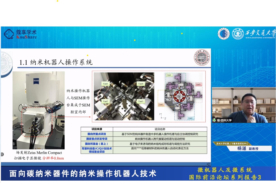 1月19日,應(yīng)機電工程學院及研究生院邀請,蘇州大學機器人與微系統(tǒng)研究中心楊湛副教授,做客我校與西安交通大學聯(lián)合舉辦的“微機器人及微系統(tǒng)國際前沿論壇系列報告3”,作了題為“面向碳納米器件的納米操作機器人技術(shù)”的學術(shù)報告。報告會采用線上與線下相結(jié)合的方式,通過“蔻享學術(shù)”平臺進行了在線直播。報告會由機電工程學院常博教授主持,校內(nèi)外300多位學者及研究生聆聽了此次精彩報告。