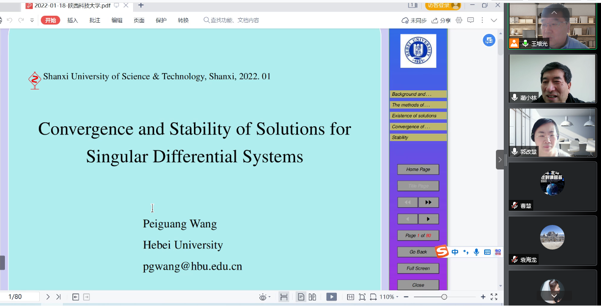 1月18日上午,應(yīng)數(shù)學(xué)與數(shù)據(jù)科學(xué)學(xué)院邀請(qǐng),河北大學(xué)副校長(zhǎng)、教育部大學(xué)數(shù)學(xué)課程教指委委員王培光做客我校“前沿科學(xué)報(bào)告”,作了題為“Convergence for Singular Differential Systems with Maxima”的學(xué)術(shù)報(bào)告。副校長(zhǎng)李學(xué)軍出席報(bào)告會(huì),并在報(bào)告會(huì)之前線上與王培光副校長(zhǎng)進(jìn)行了交流。報(bào)告由數(shù)學(xué)學(xué)院院長(zhǎng)藺小林主持,數(shù)學(xué)學(xué)院領(lǐng)導(dǎo)、全體教師和研究生參加了本次報(bào)告。