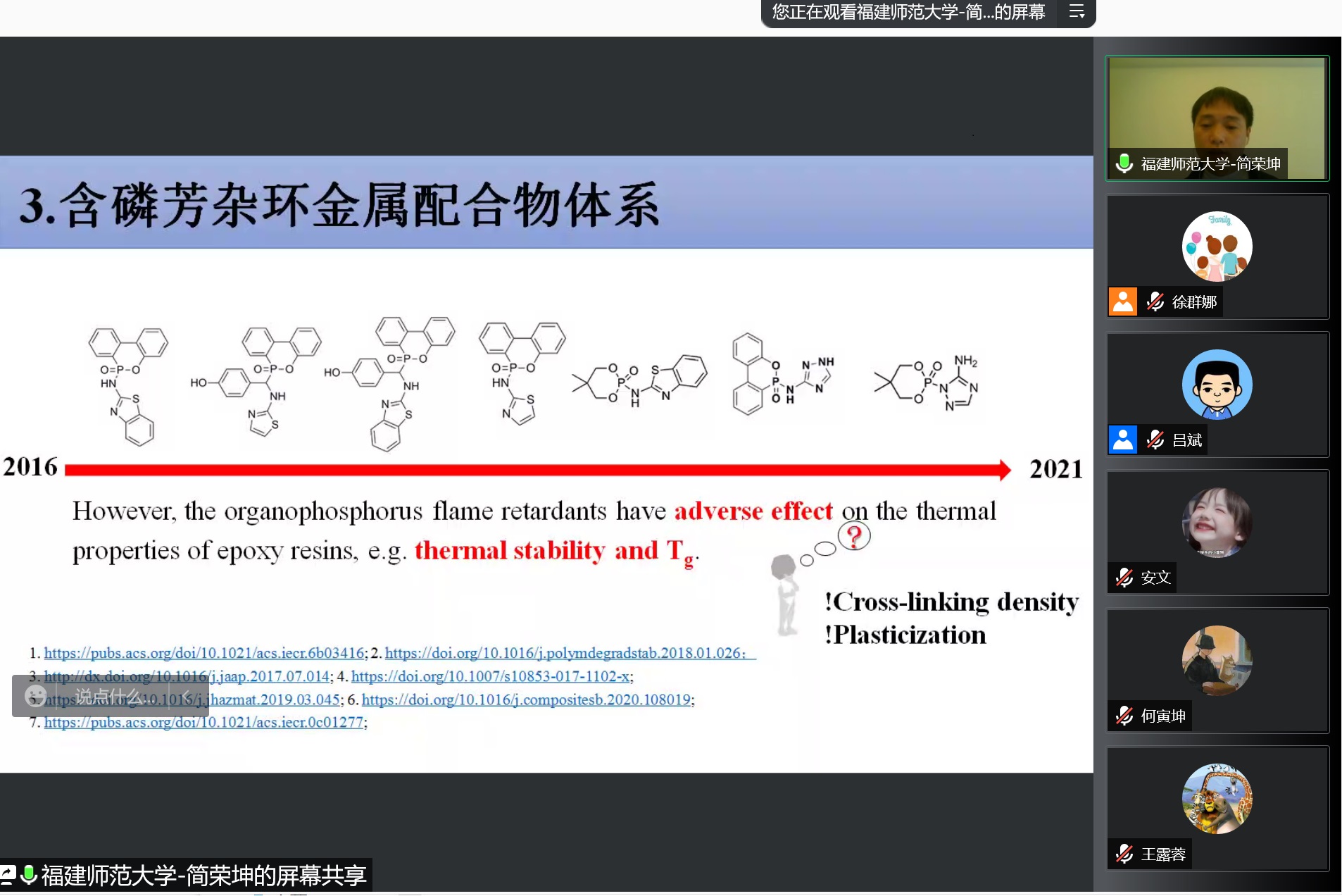 1月5日上午,受輕工科學(xué)與工程學(xué)院、科技處及前沿院邀請(qǐng),福建師范大學(xué)簡(jiǎn)榮坤教授做客我?!扒把乜茖W(xué)報(bào)告”,作了題為“環(huán)氧樹(shù)脂阻燃改性進(jìn)展”的線上學(xué)術(shù)報(bào)告。輕工學(xué)院部分教師及研究生聆聽(tīng)了本次報(bào)告。報(bào)告由輕工科學(xué)與工程學(xué)院院長(zhǎng)呂斌主持。