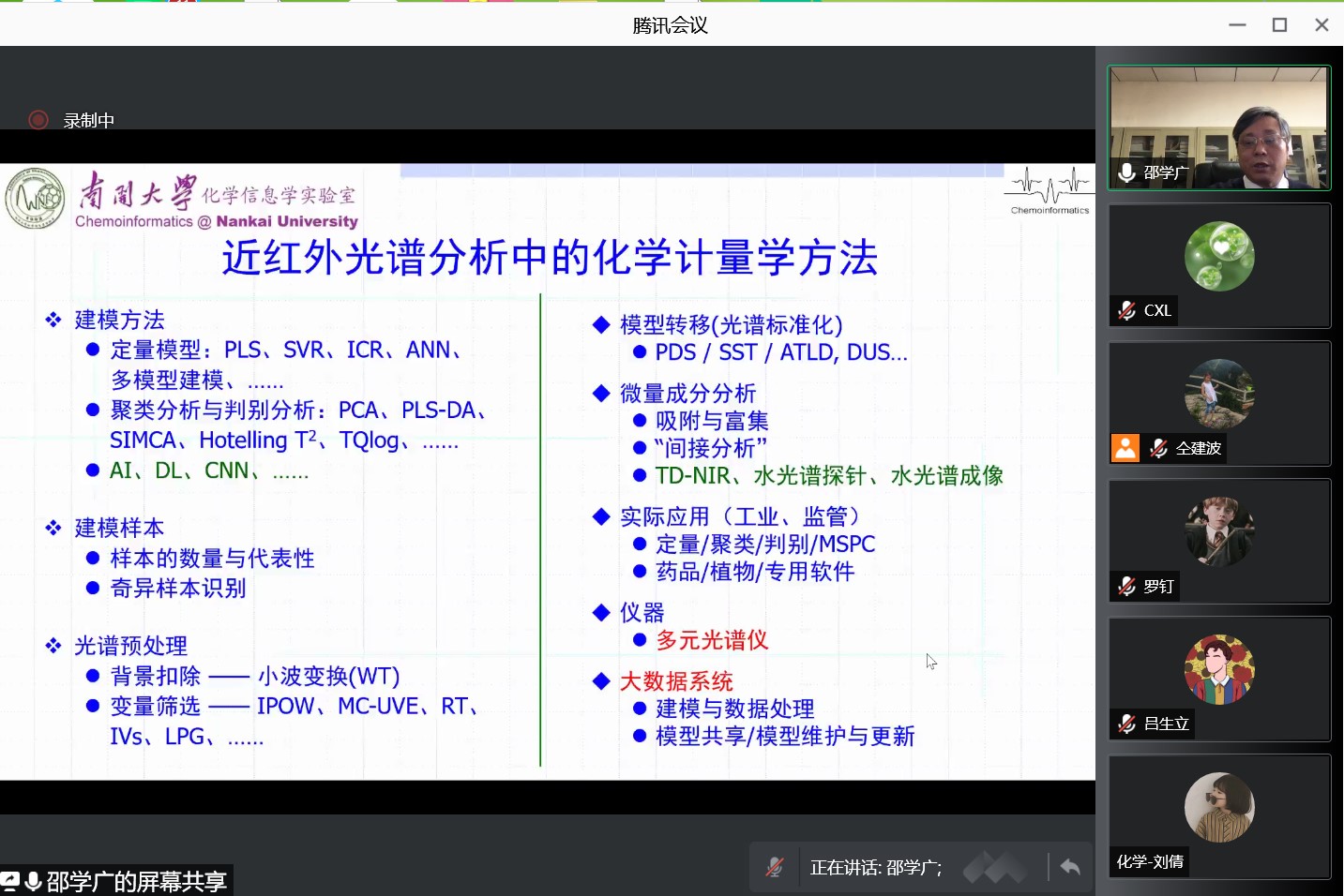 邵學(xué)廣教授主要報(bào)告了采用水的近紅外光譜信號(hào)作為探針?lè)治鲶w系的組成、結(jié)構(gòu)及含量進(jìn)行探測(cè);并介紹了溫控近紅外光譜分析技術(shù)對(duì)目標(biāo)物的含量和結(jié)構(gòu)進(jìn)行分析。重點(diǎn)介紹了將高維數(shù)據(jù)分析方法、化學(xué)計(jì)量學(xué)方法和分子模擬技術(shù)等與水的近紅外光譜結(jié)合分析,實(shí)現(xiàn)了水的不同結(jié)構(gòu)形式以及水光譜的精細(xì)結(jié)構(gòu)信息,并研究了蛋白質(zhì)和聚合物的熱變性過(guò)程。報(bào)告最后,邵學(xué)廣教授就師生們對(duì)于FMA算法的局限性、動(dòng)力學(xué)模擬在化學(xué)計(jì)量學(xué)中的應(yīng)用等相關(guān)問(wèn)題進(jìn)行了細(xì)致解答。