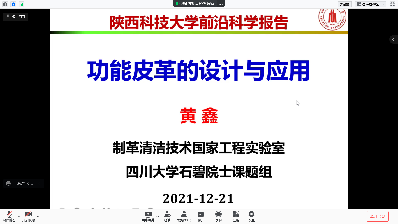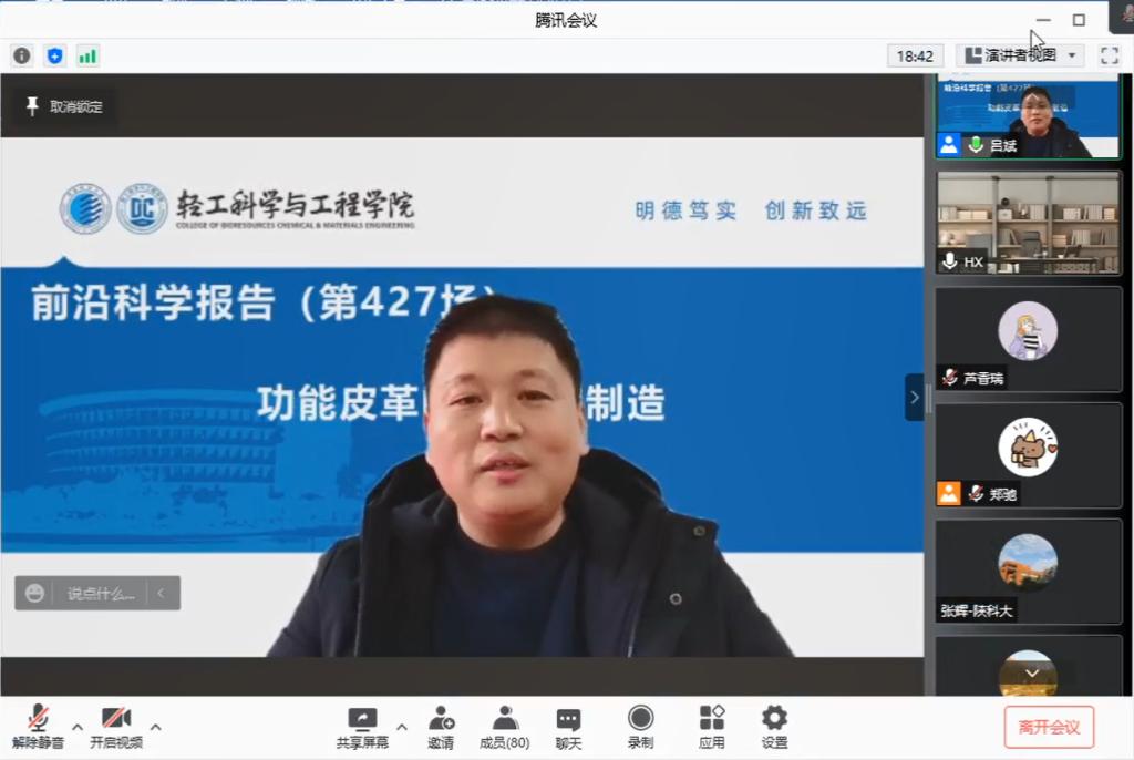 12月21日上午,受輕工科學(xué)與工程學(xué)院、科技處及前沿院邀請(qǐng),國(guó)家優(yōu)秀青年科學(xué)基金獲得者四川大學(xué)黃鑫研究員以線上形式就“功能皮革的設(shè)計(jì)與制造”與輕工學(xué)院師生進(jìn)行深入交流。報(bào)告由輕工學(xué)院院長(zhǎng)呂斌主持,學(xué)院相關(guān)專業(yè)教師及研究生參加了本次學(xué)術(shù)報(bào)告會(huì)。