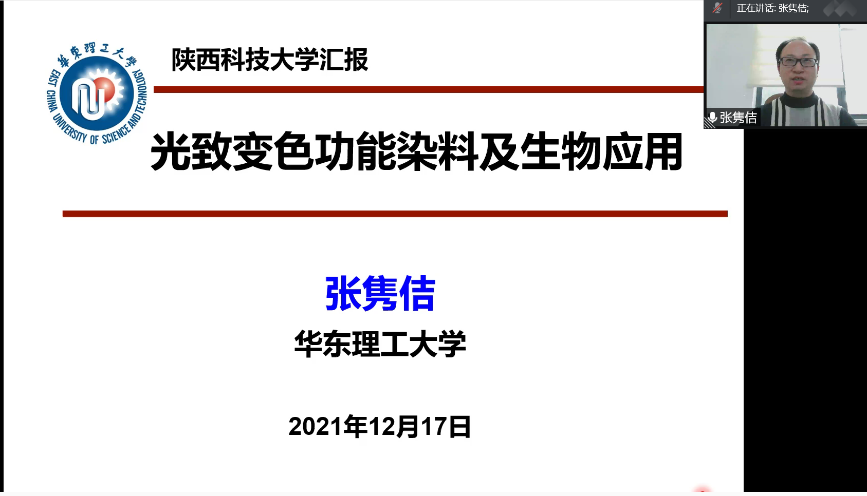 12月17日下午,應(yīng)我校輕工科學(xué)與工程學(xué)院、科技處及前沿院邀請,國家級人才稱號獲得者、華東理工大學(xué)張雋佶副教授做客我?!扒把乜茖W(xué)報告”,作了題為《光致變色功能染料及生物應(yīng)用研究》的報告。報告由輕工學(xué)院院長呂斌主持,輕工學(xué)院教師和研究生、本科生參加了此次報告。