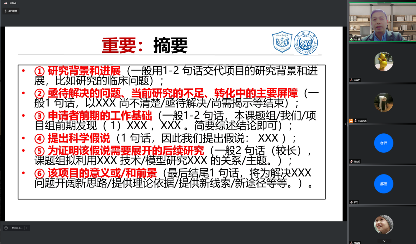 12月16日晚,應(yīng)設(shè)計(jì)與藝術(shù)學(xué)院與科技處邀請,同濟(jì)大學(xué)牛文鑫教授云端做客我?!扒把乜茖W(xué)報(bào)告”,作了題為“國家自然科學(xué)基金申請書撰寫規(guī)范”的學(xué)術(shù)報(bào)告。報(bào)告會由設(shè)藝學(xué)院副院長賀雪梅教授主持,學(xué)院全體教師及部分研究生聆聽了此次精彩分享。