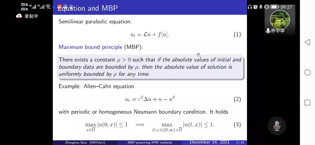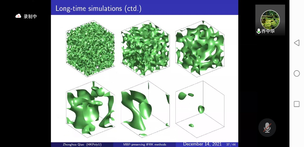12月14日上午,應(yīng)數(shù)學(xué)與數(shù)據(jù)科學(xué)學(xué)院邀請,香港理工大學(xué)喬中華教授做客我?!扒把乜茖W(xué)報告”,通過騰訊會議作了題為“Maximum bound principle preserving integrating factor Runge-Kutta methods for semilinear parabolic equations”的線上報告。報告會由數(shù)學(xué)學(xué)院副院長李劍教授主持,學(xué)院相關(guān)專業(yè)教師和研究生參加了報告會。