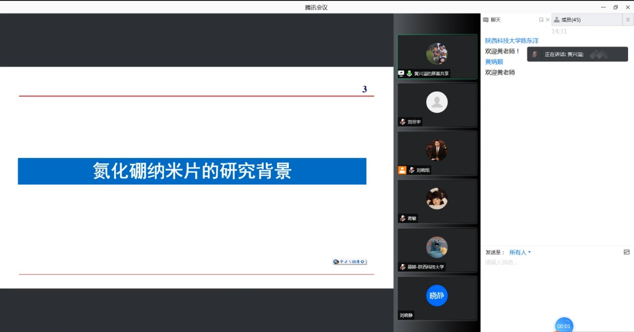 12月11日下午,應(yīng)材料科學(xué)與工程學(xué)院邀請,上海交通大學(xué)黃興溢教授做客我?!扒把乜茖W(xué)報告”論壇,作了題為“二維氮化硼納米片的制備及應(yīng)用”的學(xué)術(shù)報告。本次報告由材料學(xué)院劉曉旭教授主持,學(xué)院相關(guān)教師和學(xué)生參加了本次報告會,因疫情影響,本次報告采取線上的方式進行。