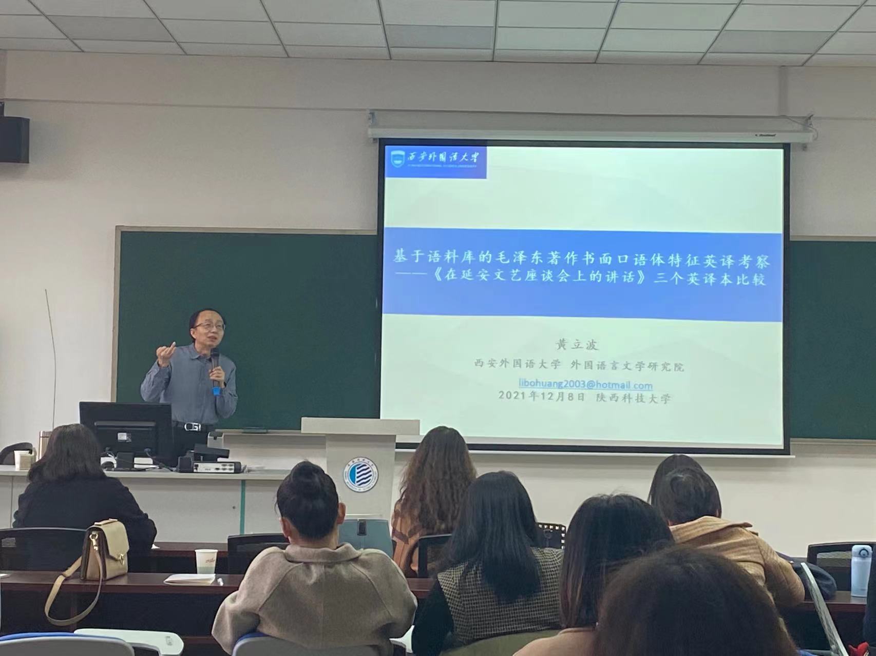 12月8日下午,應文理學院邀請,西安外國語大學黃立波教授做客我校前沿科學報告,作了題為《基于語料庫的毛澤東著作書面口語體特征英譯考察——<在延安文藝座談會上的講話>三個英譯本比較》的報告。報告由外語系主任李俊葉主持,外語系教師和翻譯專業(yè)研究生聆聽了此次報告。