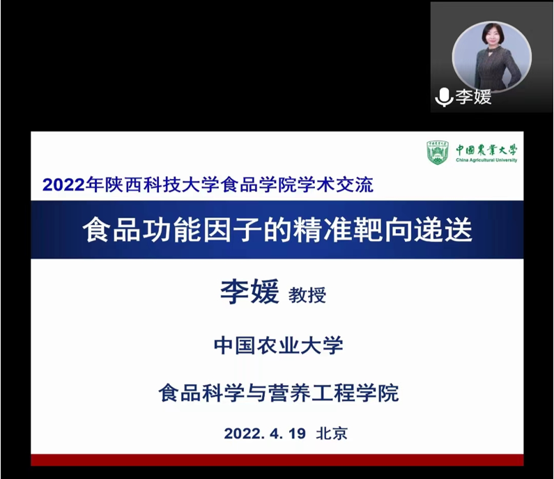 4月19日上午,應(yīng)食品與生物工程學(xué)院及科技處邀請,中國農(nóng)業(yè)大學(xué)李媛教授做客我校前沿科學(xué)報告,以“食品功能因子的精準(zhǔn)靶向遞送”為題進(jìn)行學(xué)術(shù)報告,因疫情影響,采取了線上騰訊會議的方式進(jìn)行。食品學(xué)院教師和研究生參加了本次報告會,報告會由食品學(xué)院副院長李國梁教授(主持工作)主持。