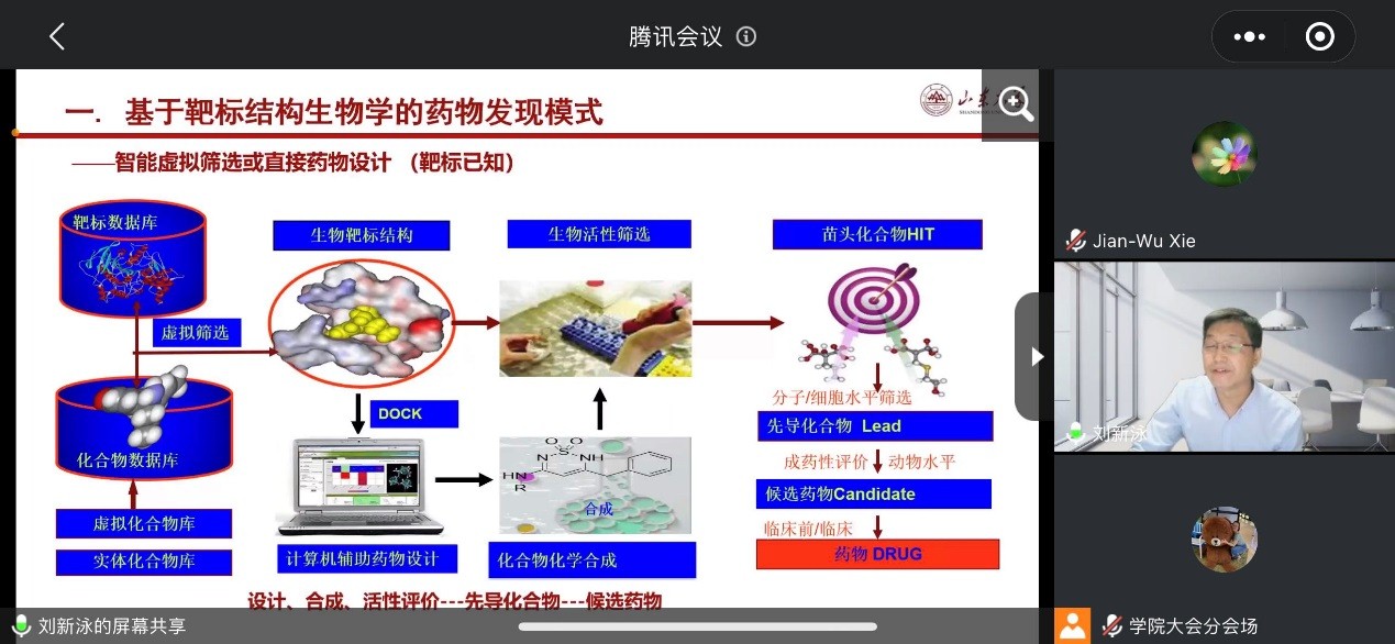 近日,應(yīng)食品與生物工程學院及科技處邀請,山東大學創(chuàng)新藥物研究院院長、藥物化學所所長、山東省新藥設(shè)計與創(chuàng)新藥物研究重點實驗室主任劉新泳教授,貴州醫(yī)科大學副校長沈祥春教授做客我校前沿科學報告,分別作了題為“基于靶標的創(chuàng)新藥物發(fā)現(xiàn)與開發(fā)”和“OMT防治心肌重塑的效應(yīng)機制”的線上學術(shù)報告。報告由食品學院副院長李國梁(主持工作)主持,學院教師及研究生參加了本次報告。