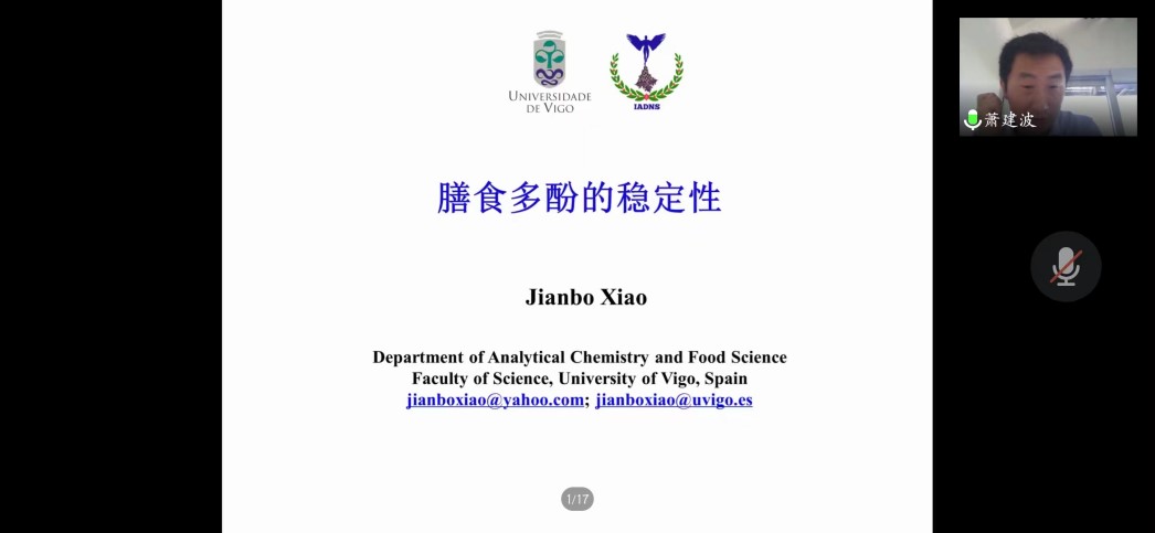 近日,西班牙維戈大學蕭建波教授應邀做客我校前沿科學報告,以“膳食多酚的穩(wěn)定性”為題進行學術報告,因疫情影響,采取了騰訊會議的方式進行。食品與生物工程學院教師和研究生代表參加了本次報告會,報告會由食品學院副院長李國梁(主持工作)主持。