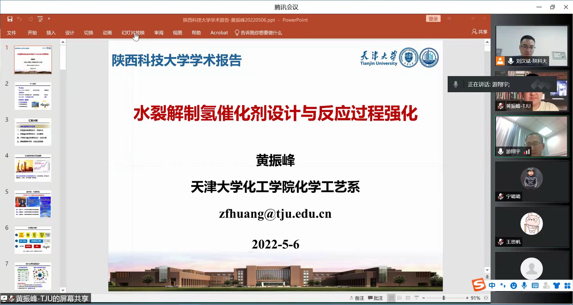 5月6日下午,應(yīng)我校輕工科學(xué)與工程學(xué)院、科技處及前沿院邀請,天津大學(xué)黃振峰教授做客我校前沿科學(xué)報(bào)告,作了題為“水裂解制氫催化劑設(shè)計(jì)與反應(yīng)過程強(qiáng)化”的線上學(xué)術(shù)報(bào)告。報(bào)告會由輕工學(xué)院院長助理游翔宇主持,學(xué)院相關(guān)專業(yè)教師及部分研究生聆聽了此次報(bào)告會。