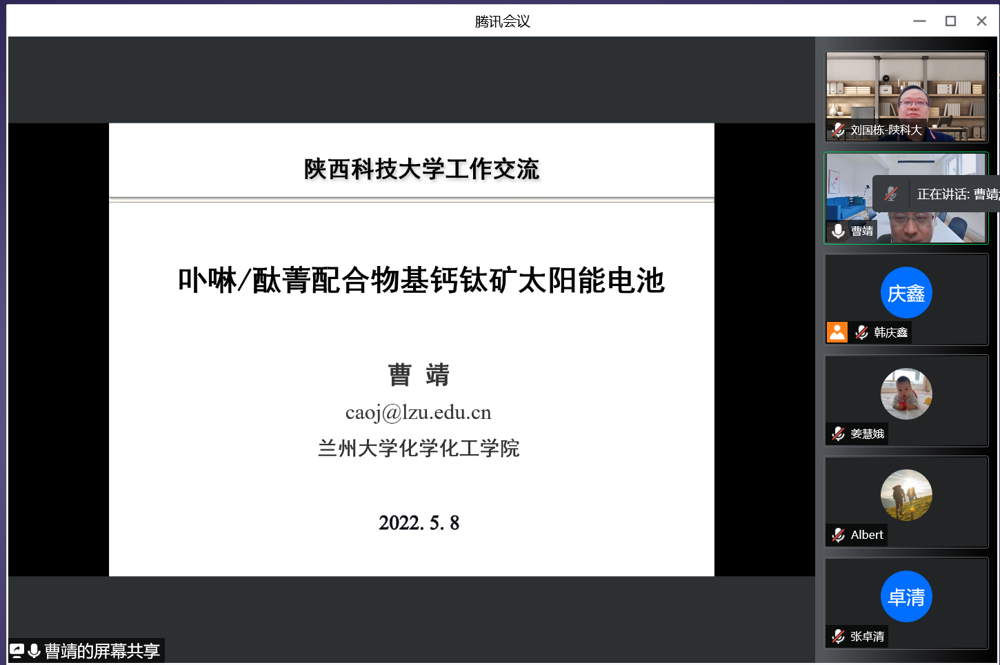 5月9日上午,應(yīng)我校輕工科學(xué)與工程學(xué)院、科技處及前沿院邀請(qǐng),蘭州大學(xué)曹靖教授做客我校前沿科學(xué)報(bào)告,作了題為“卟啉/酞菁配合物基鈣鈦礦太陽能電池”的線上學(xué)術(shù)報(bào)告。報(bào)告會(huì)由科學(xué)與工程學(xué)院副院長(zhǎng)劉國(guó)棟主持,學(xué)院相關(guān)專業(yè)教師及部分研究生聆聽了此次報(bào)告會(huì)。